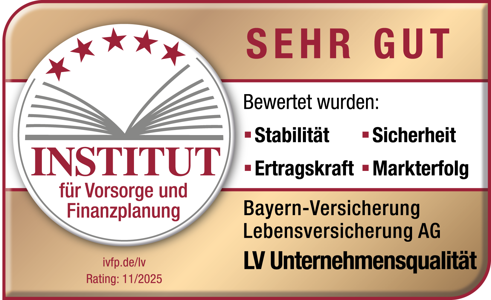 Im Gesamtrating bewertete das Analysehaus MORGEN & MORGEN im Jahr 2025 die Lebensversicherer auf Basis der Unternehmensdaten der letzten fünf Jahre aus Anlegersicht. Bayern-Versicherung Lebensversicherung AG erhielt dabei die Gesamtnote „sehr gut“. Dies bestärkt uns in unserer Überzeugung, dass wir Ihnen Stabilität und Verlässlichkeit bieten. Als Versicherer stehen wir für eine nachhaltige Finanzkraft und eine solide Geschäftspolitik, die Ihre Sicherheit in den Mittelpunkt stellt. Wir setzen auf transparente Prozesse und eine langfristige Kundenorientierung, um Ihnen nicht nur heute, sondern auch in Zukunft verlässliche Leistungen zu garantieren.