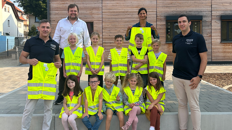 Ende August, pünktlich zum Start des neuen Schuljahres, besuchten Ralf Weis und Dominic Giebel von der Saarland Versicherung die neuen Erstklässler der Grundschule Marpingen. Gemeinsam mit Bürgermeister Volker Weber überreichten sie insgesamt 95 leuchtend gelbe Warnwesten und Gummibärchen an die frischgebackenen ABC-Schützen.